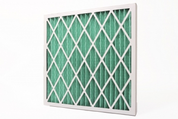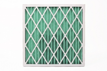 此折景濾網使用人纖濾材,擴張網置於出風面,貼合紙板成型。